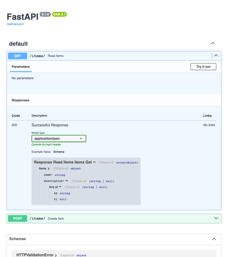 And if you check all the available Schemas (JSON Schemas) in OpenAPI, you will see that there are two, one Item-Input