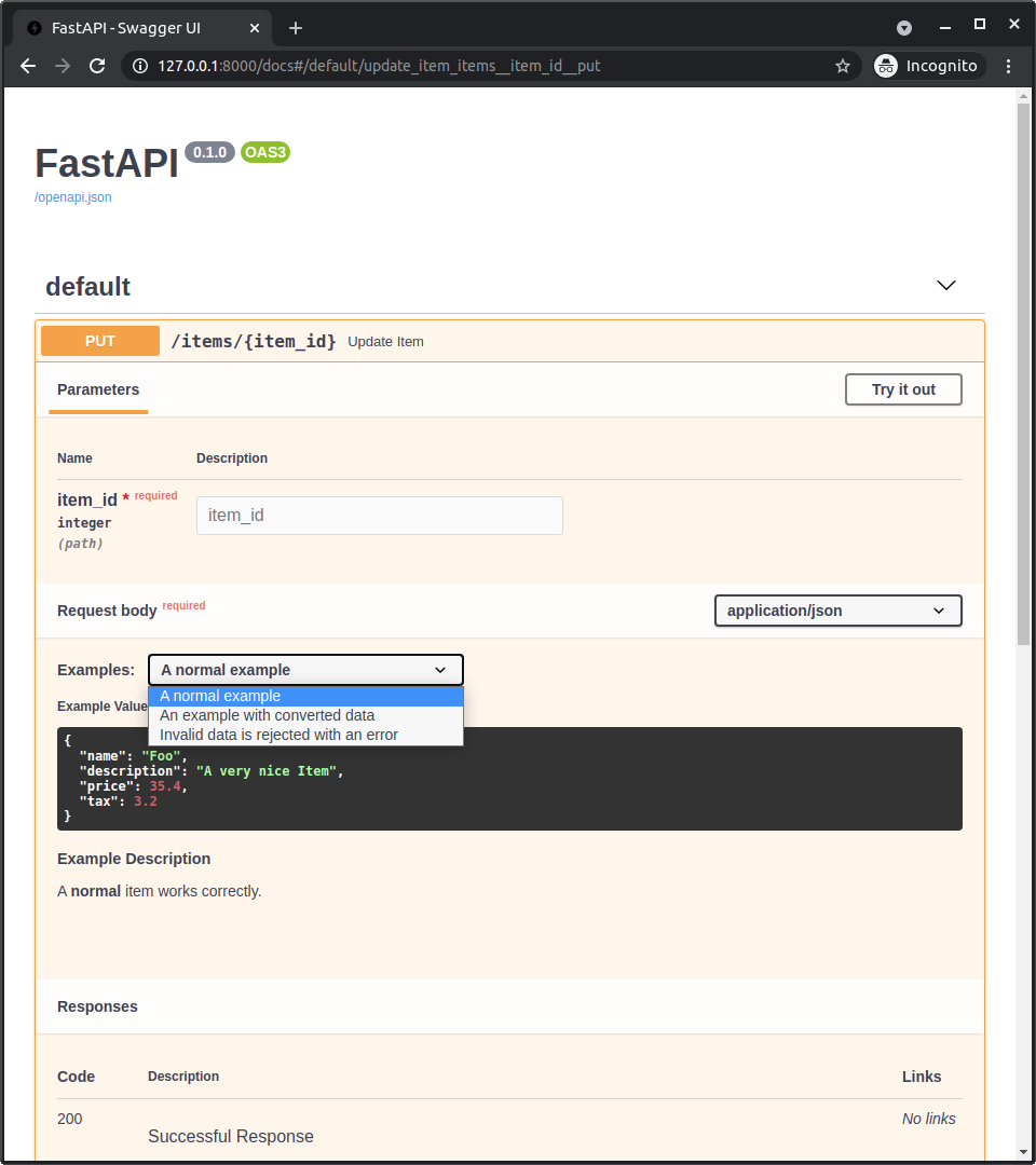 But now that FastAPI 0.99.0 and above uses OpenAPI 3.1.0, that uses JSON Schema 2020-12, and Swagger UI 5.0.0 and above, everything is more consistent and the examples are included in JSON Schema.