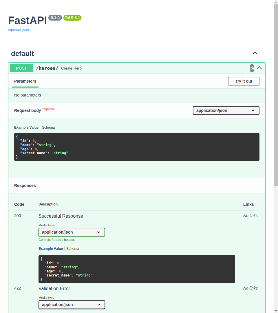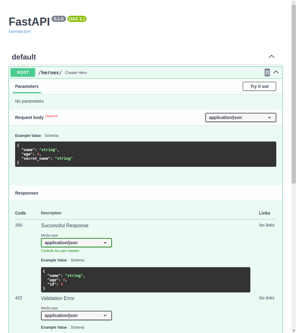 data model is somewhat special, it has all the same fields that would be needed to create a new hero, but all the fields are optional (they all have a default value). This way, when you update a hero, you can send just the fields that you want to update.